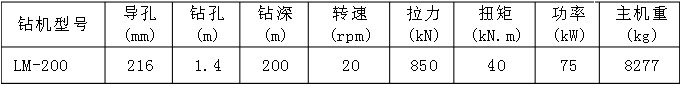 (4)鉆具 鉆具包括φ216mm導孔鉆頭、φ1.4m擴孔鉆頭、φ2.0m擴孔鉆頭(因為φ2.0m擴孔鉆頭比φ1.4m鉆頭一邊只大30cm,且鉆頭較重、鉆進速度較慢,所以一般不采用。)、鉆桿(開孔鉆桿、穩(wěn)定鉆桿和普通鉆桿)等。在斜井施工中,為減少阻力,使用φ1.4m擴孔鉆頭更為有效。 3.3 施工技術(shù)參數(shù) (1)我局豎井、斜井施工設備選取的反井鉆機機型為LM-200型。詳細參數(shù)見表3-1、表3-2。