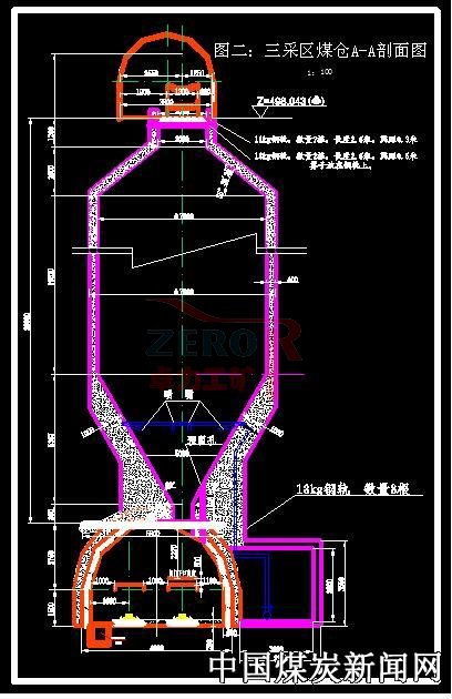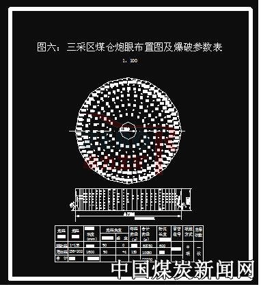 2、支護形式。(1)煤倉擴刷期間:煤倉采用錨網噴作為臨時支護,錨桿采用Φ20mm,長2.0m的螺紋金屬錨桿,錨桿間排距為750mm×800mm;金屬網規格為1560mm×900mm,噴厚為100mm。(2)煤倉擴刷到位后:煤倉上口和倉身選用Φ20mm的螺紋鋼筋+混凝土澆灌,澆灌厚度為500mm。煤倉下口澆灌選用18kg鋼軌+Φ20mm的螺紋鋼筋聯合澆灌,煤倉下口澆灌厚度為1.0m。