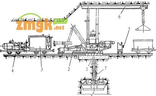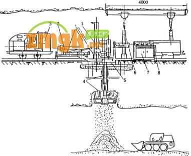 6-吊掛裝置 7-鉆機(jī)(包括三牙輪鉆頭、鉆桿、擴(kuò)孔刀盤)